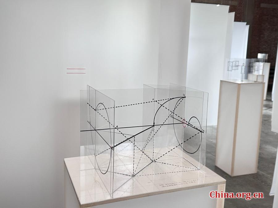 Folded, interlaced geometric lines drawn on acrylic sheets are displayed in "Two-Dimensional Transparent Sculpture" at Beijing Commune, Aug. 14, 2025. The composition reads as one diagram from the front and as shifting fragments when viewed in motion. [Photo by Liu Ziying/China.org.cn]