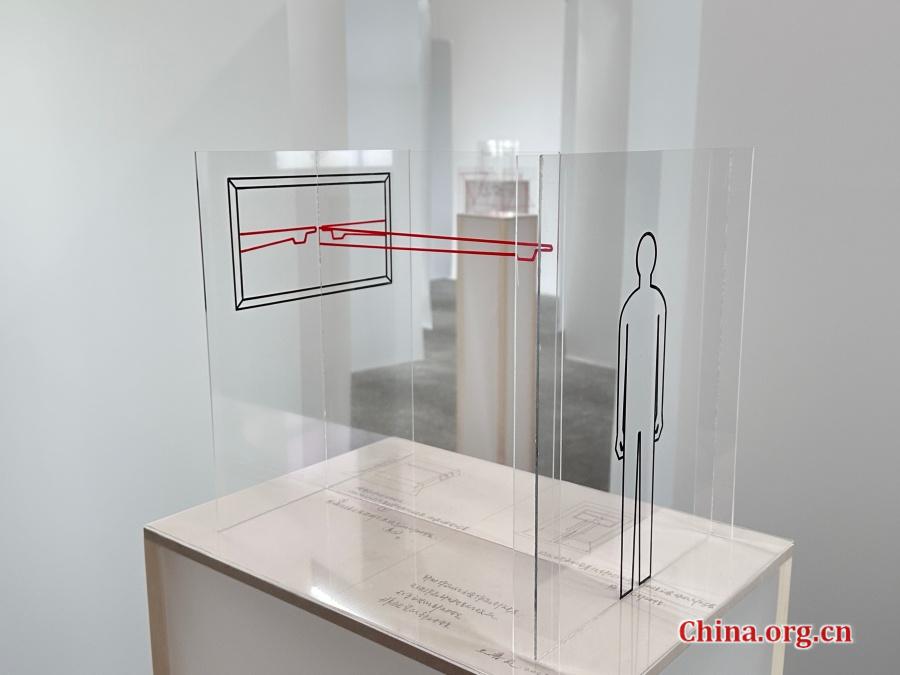 Two red hands pointing toward each other are drawn on one acrylic sheet in "Two-Dimensional Transparent Sculpture" at Beijing Commune, Aug. 14, 2025. The gesture generates a third pointing hand that addresses a figure on another acrylic plane, creating a chain of direction. [Photo by Liu Ziying/China.org.cn]