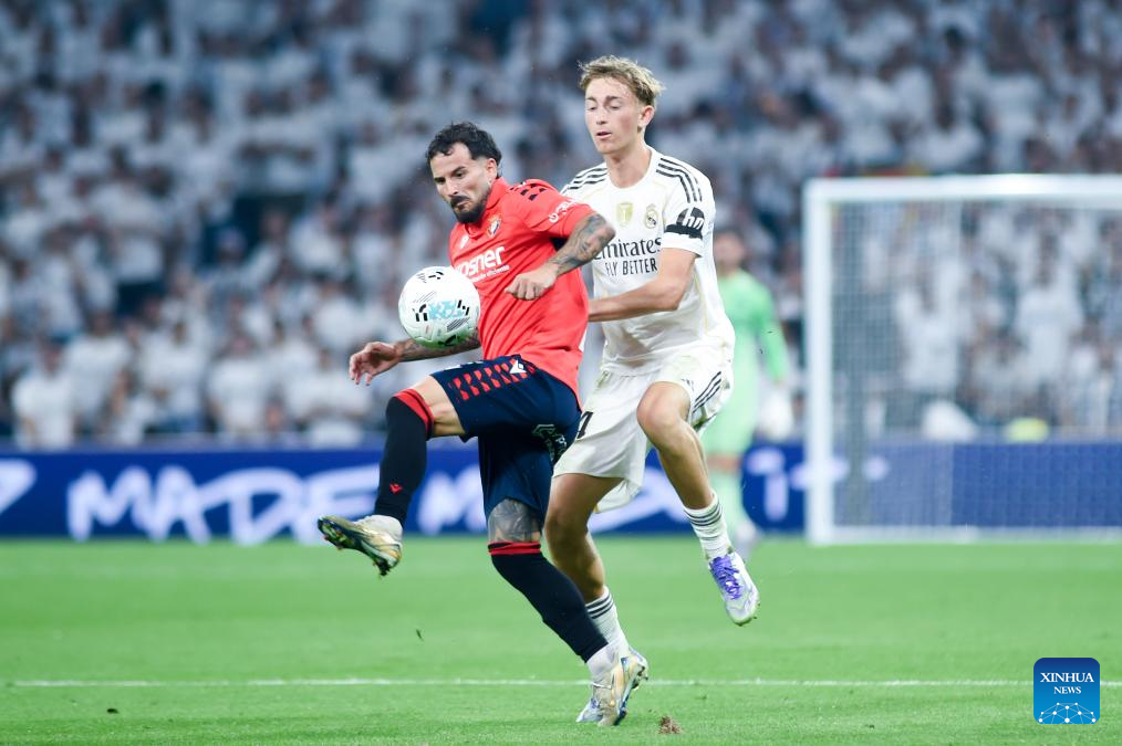 Dean Huijsen (R) of Real Madrid vies with Ruben Garcia of CA Osasuna during the La liga football match between Real Madrid and CA Osasuna in Santiago Bernabeu Stadium, Madrid, Spain, on Aug. 19, 2025. (Photo by Gustavo Valiente/Xinhua)