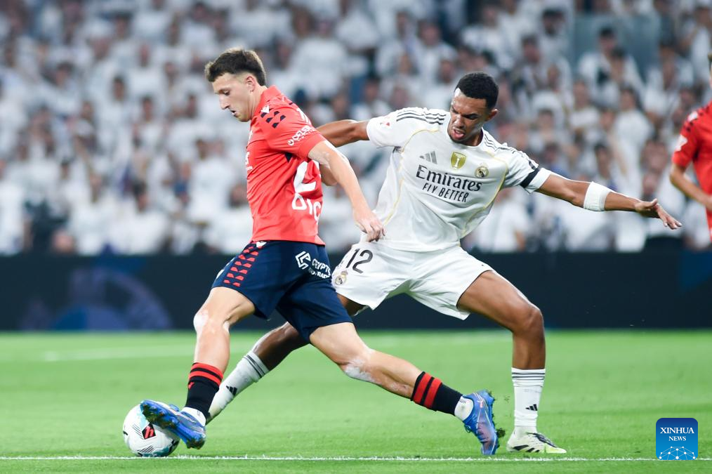 Alexander-Arnold of Real Madrid vies with Abel Bretones of CA Osasuna during the La liga football match between Real Madrid and CA Osasuna in Santiago Bernabeu Stadium, Madrid, Spain, on Aug. 19, 2025. (Photo by Gustavo Valiente/Xinhua)
