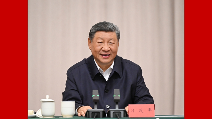 Chinese President Xi Jinping, also general secretary of the Communist Party of China (CPC) Central Committee and chairman of the Central Military Commission, listens to work reports from the CPC Xizang regional committee and the regional government and delivers an important speech in Lhasa, southwest China's Xizang Autonomous Region, Aug. 20, 2025. [Photo/Xinhua]