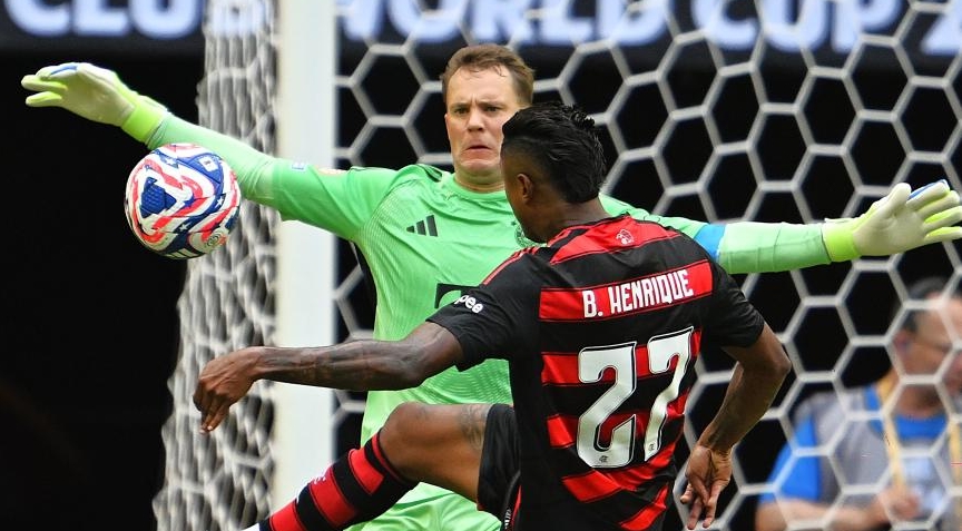 Bruno Henrique (front) of CR Flamengo vies with Manuel Neuer, goalkeeper of Bayern Munich, during the round of 16 match between CR Flamengo of Brazil and Bayern Munich of Germany at the FIFA Club World Cup 2025 at the Hard Rock Stadium, Miami, Florida, the United States, June 29, 2025. (Xinhua/Wu Xiaoling)