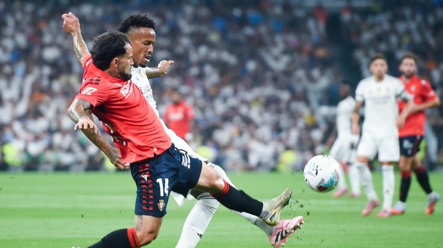 Eder Militao (back) of Real Madrid vies with Ruben Garcia of CA Osasuna during the La liga football match between Real Madrid and CA Osasuna in Santiago Bernabeu Stadium, Madrid, Spain, on Aug. 19, 2025. (Photo by Gustavo Valiente/Xinhua)