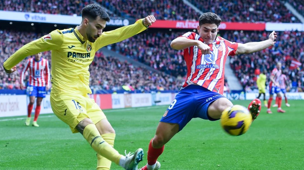 Julian Alvarez(R) of Atletico de Madrid vies with Alex Baena of Villarreal CF during the LaLiga football match between Atletico de Madrid and Villarreal CF, in Madrid, Spain, Jan. 25, 2025. (Photo by Gustavo Valiente/Xinhua)