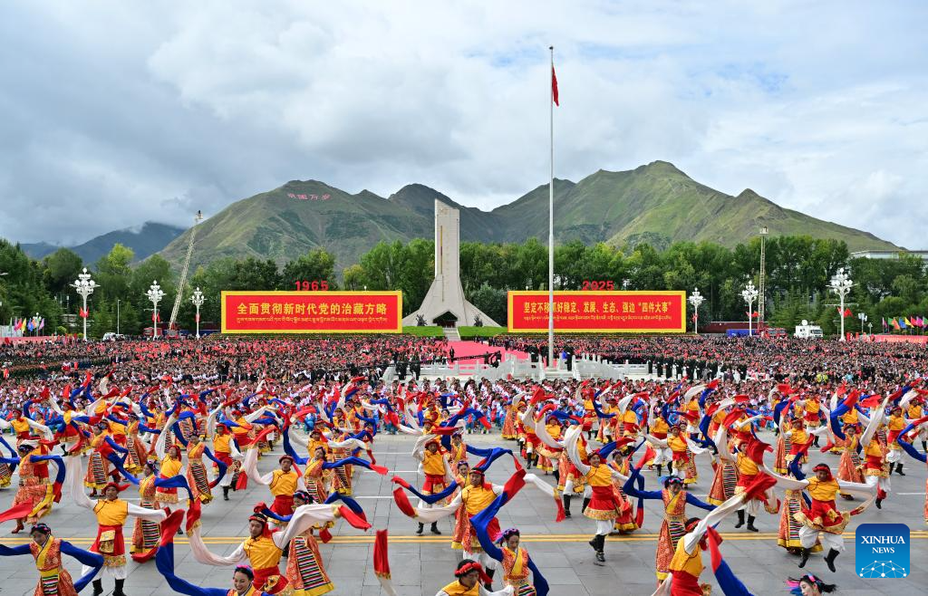 People take part in a mass parade during a grand gathering to celebrate Xizang Autonomous Region's 60th founding anniversary in Lhasa, southwest China's Xizang Autonomous Region, Aug. 21, 2025. Around 20,000 local officials and people from all ethnic groups and all walks of life joined in the celebration. (Xinhua/Zhai Jianlan)