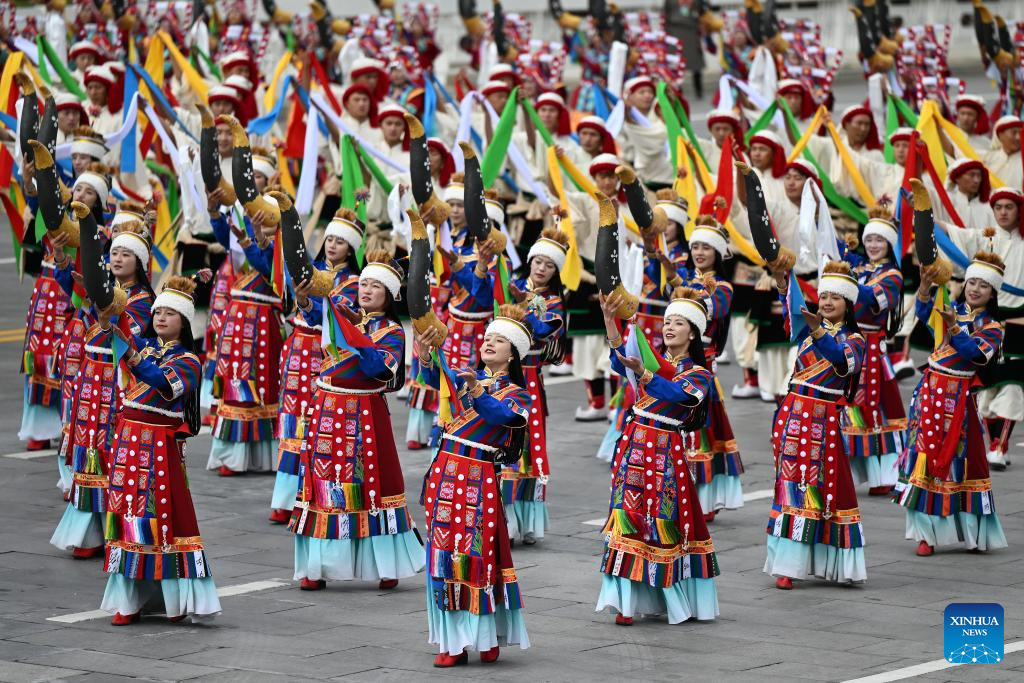 People take part in a mass parade during a grand gathering to celebrate Xizang Autonomous Region's 60th founding anniversary in Lhasa, southwest China's Xizang Autonomous Region, Aug. 21, 2025. Around 20,000 local officials and people from all ethnic groups and all walks of life joined in the celebration. (Xinhua/Yin Bogu)