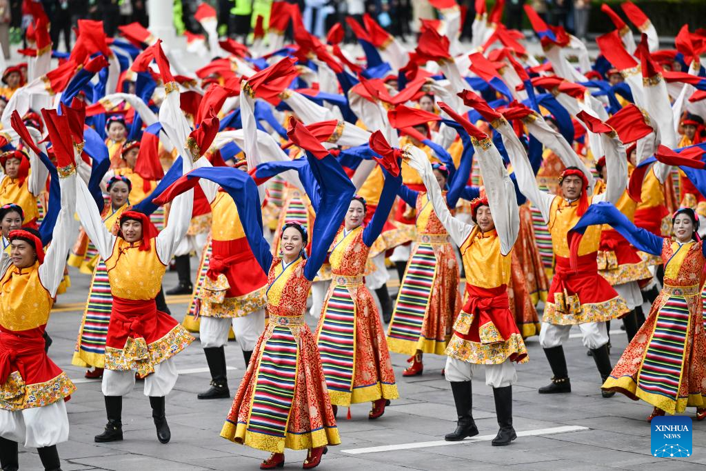 People take part in a mass parade during a grand gathering to celebrate Xizang Autonomous Region's 60th founding anniversary in Lhasa, southwest China's Xizang Autonomous Region, Aug. 21, 2025. Around 20,000 local officials and people from all ethnic groups and all walks of life joined in the celebration. (Xinhua/Yin Bogu)