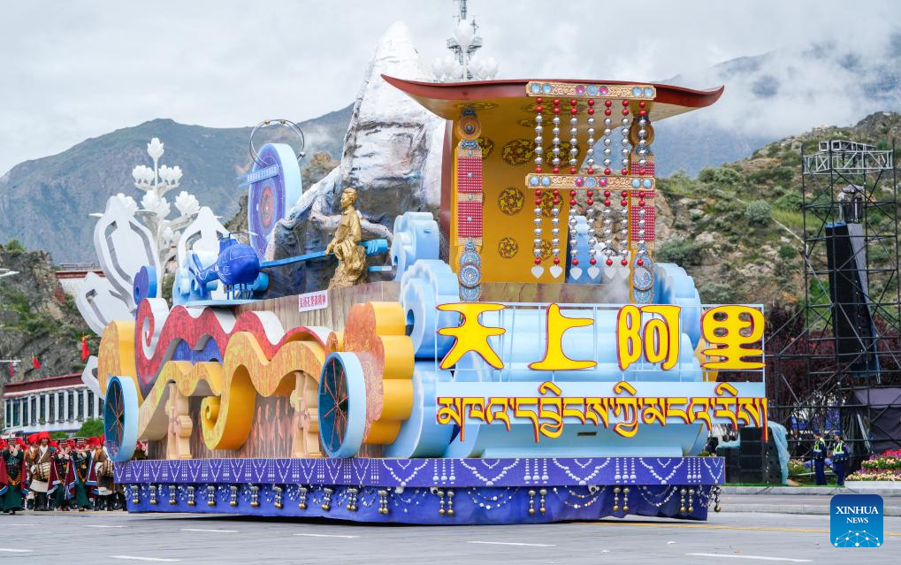 A parade float takes part in a grand gathering to celebrate Xizang Autonomous Region's 60th founding anniversary in Lhasa, southwest China's Xizang Autonomous Region, Aug. 21, 2025. Around 20,000 local officials and people from all ethnic groups and all walks of life joined in the celebration. (Xinhua/Tenzin Nyida)