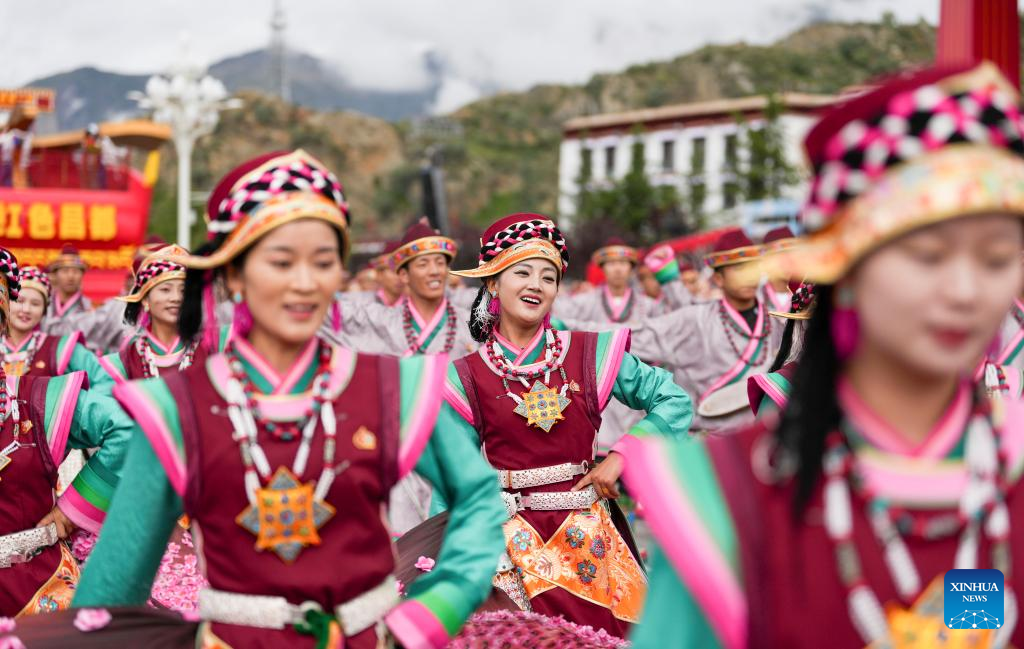 People take part in a mass parade during a grand gathering to celebrate Xizang Autonomous Region's 60th founding anniversary in Lhasa, southwest China's Xizang Autonomous Region, Aug. 21, 2025. Around 20,000 local officials and people from all ethnic groups and all walks of life joined in the celebration. (Xinhua/Jigme Dorje)