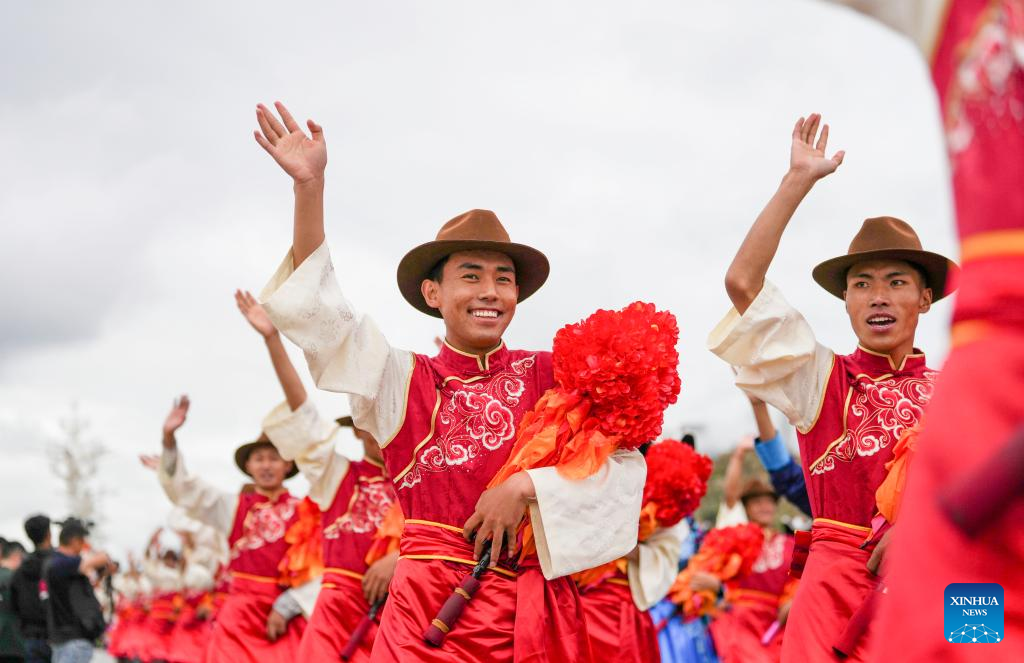 People take part in a mass parade during a grand gathering to celebrate Xizang Autonomous Region's 60th founding anniversary in Lhasa, southwest China's Xizang Autonomous Region, Aug. 21, 2025. Around 20,000 local officials and people from all ethnic groups and all walks of life joined in the celebration. (Xinhua/Jigme Dorje)