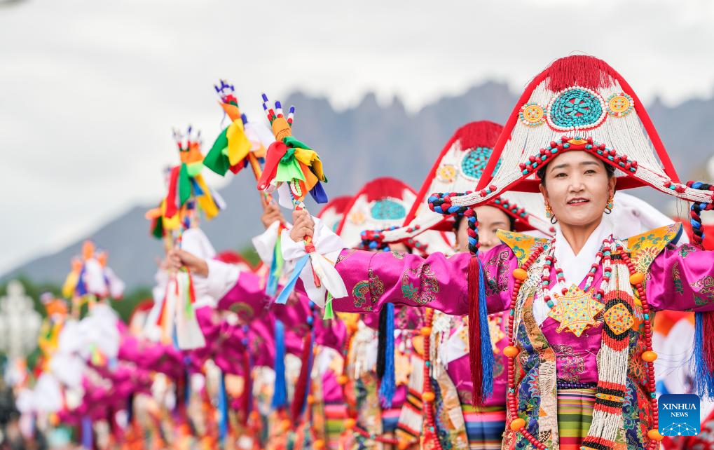 People take part in a mass parade during a grand gathering to celebrate Xizang Autonomous Region's 60th founding anniversary in Lhasa, southwest China's Xizang Autonomous Region, Aug. 21, 2025. Around 20,000 local officials and people from all ethnic groups and all walks of life joined in the celebration. (Xinhua/Tenzin Nyida)