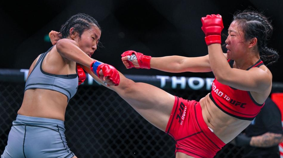 China's doctor-turned-fighter Shi Ming (right) knocks her opponent Feng Xiaocan out with a head kick in the Road to UFC final in Macao on Nov 23, 2024, earning a contract with the MMA promotion. (PHOTO / XINHUA)