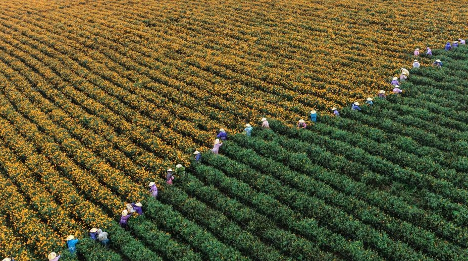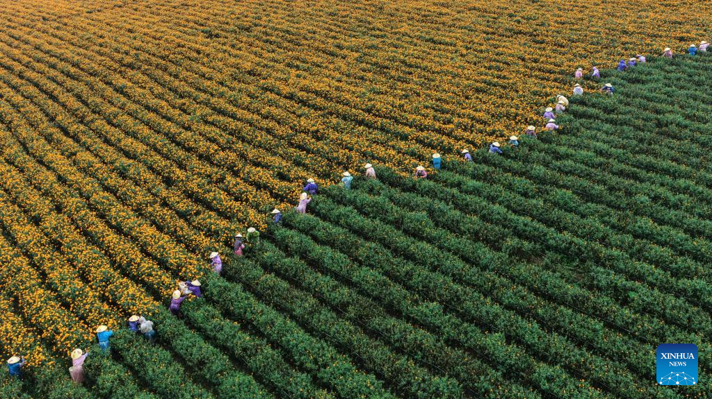 An aerial drone photo taken on Aug. 23, 2025 shows farmers harvesting marigold flowers in Tengchong, southwest China's Yunnan Province. Saturday marks the Chushu of the solar terms. Farmers across the country are busy working in the fields. (Photo by Gong Zujin/Xinhua)
