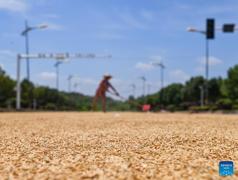 A farmer airs grain in Yongzhou City, central China's Hunan Province, Aug. 23, 2025. Saturday marks the Chushu of the solar terms. Farmers across the country are busy working in the fields. (Photo by Jiang Keqing/Xinhua)