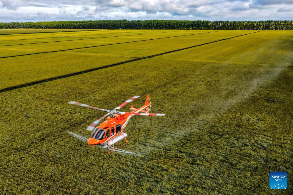An aerial drone photo taken on Aug. 23, 2025 shows a helicopter conducting a spraying operation at a farm in Shuangyashan City, northeast China's Heilongjiang Province. Saturday marks the Chushu of the solar terms. Farmers across the country are busy working in the fields. (Photo by Xu Hongyu/Xinhua)
