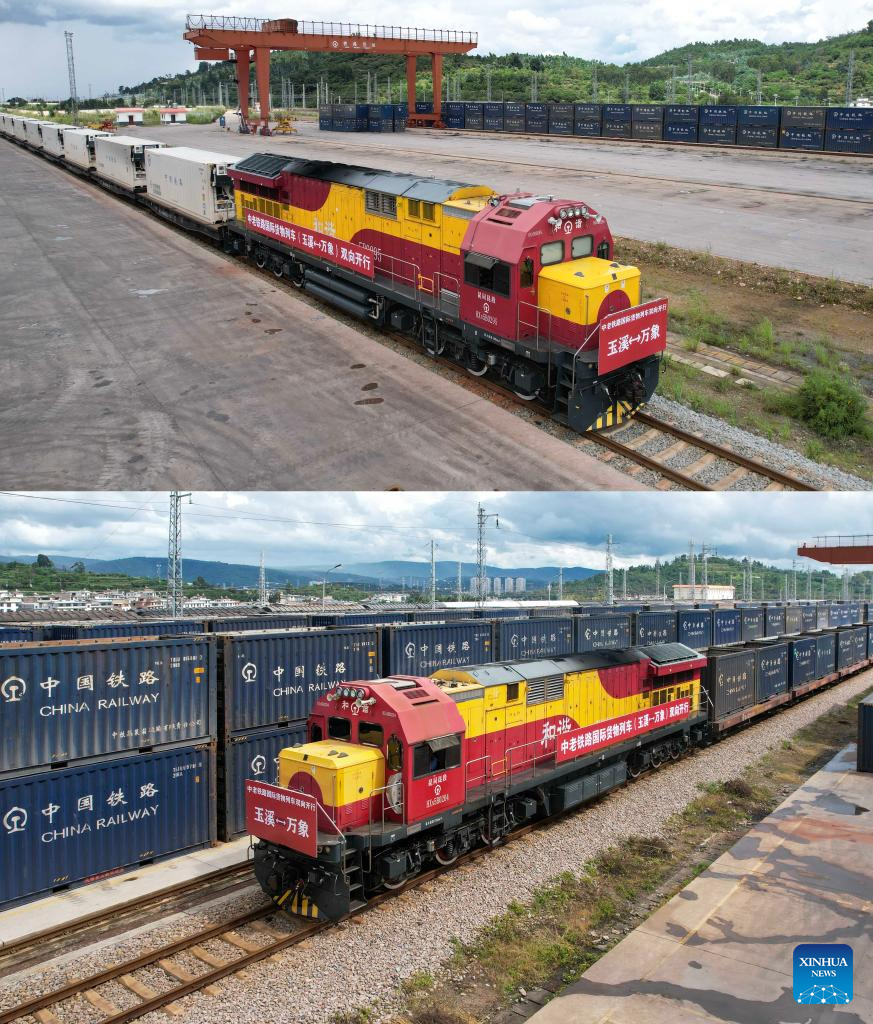 This combo aerial photo taken on Aug. 23, 2025 shows an international freight train bound for Lao capital Vientiane preparing to depart from Yanhe Station of China-Laos Railway (upper) and an international freight train, which departed from Vientiane, arriving at Yanhe Station of China-Laos Railway (lower) in Yuxi City, southwest China's Yunnan Province. The China-Laos Railway launched two-way operations of the international freight train service between Yuxi and Vientiane on Saturday. Since its inauguration in December 2021, the China-Laos Railway has transported over 64.5 million tonnes of goods by the end of July this year, including more than 14.9 million tonnes of cross-border cargo. (Xinhua/Chen Xinbo)