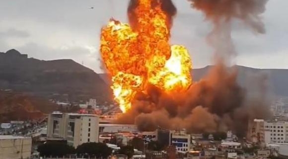 This screenshot taken from a video by cellphone shows flame and smoke rising during airstrikes in Sanaa, Yemen, Aug. 24, 2025. [Photo/Xinhua]