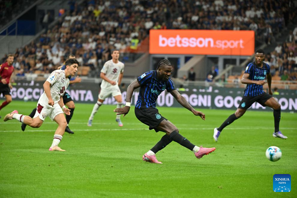 Inter Milan's Marcus Thuram (2nd R) scores during a Serie A football match between Inter Milan and Torino in Milan, Italy, Aug. 25, 2025. (Photo by Alberto Lingria/Xinhua)