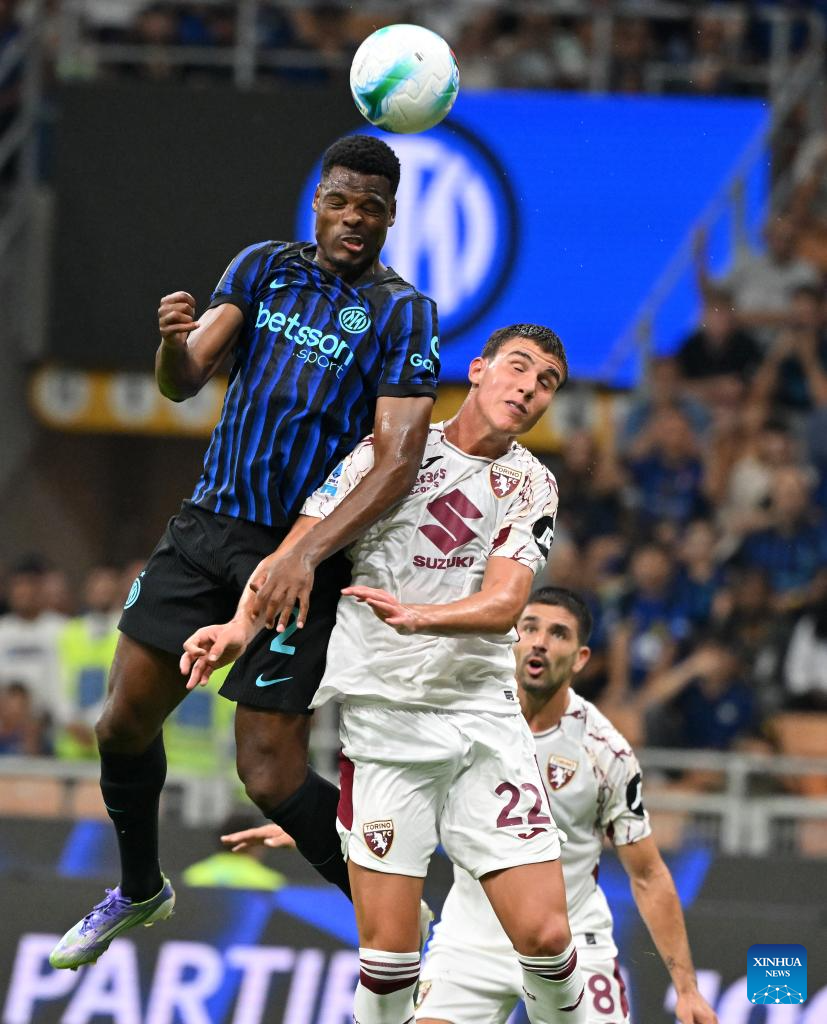 Torino's Cesare Casadei (R) vies with Inter Milan's Denzel Dumfries during a Serie A football match between Inter Milan and Torino in Milan, Italy, Aug. 25, 2025. (Photo by Alberto Lingria/Xinhua)