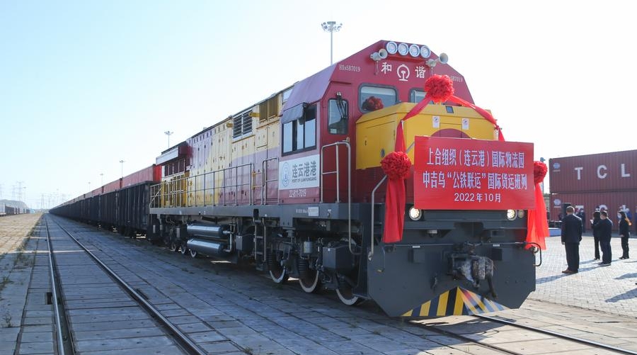 This file photo taken on Oct. 13, 2022 shows an international freight train about to depart from the Shanghai Cooperation Organization (Lianyungang) International Logistics Park in Lianyungang City, east China's Jiangsu Province. [Photo/Xinhua]