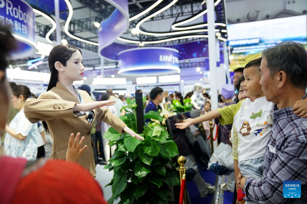 Visitors interact with a robot during the 7th China-Arab States Expo in Yinchuan, northwest China's Ningxia Hui Autonomous Region, Aug. 29, 2025. (Xinhua/Zhao Yusi)