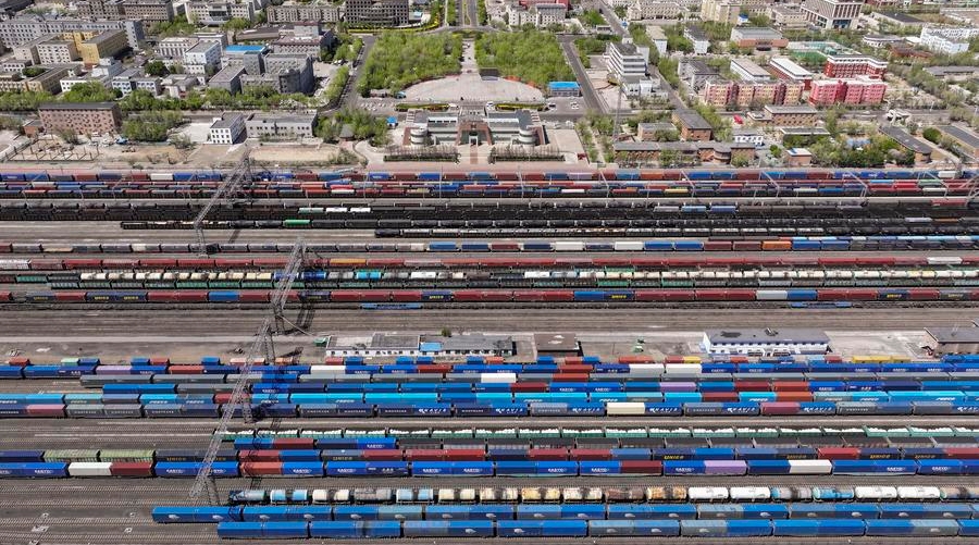 A drone photo taken on May 25, 2024 shows freight trains waiting for departure at the Alataw Pass in northwest China's Xinjiang Uygur Autonomous Region. [Photo/Xinhua]