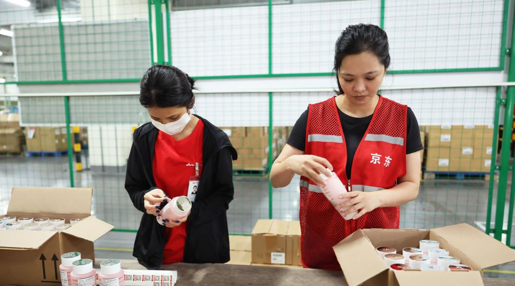 Staff members attach exclusive traceability codes to duty-free products at China Duty Free Group Hainan International Logistics Center in Haikou, south China's Hainan Province, May 26, 2025. [Photo/Xinhua]