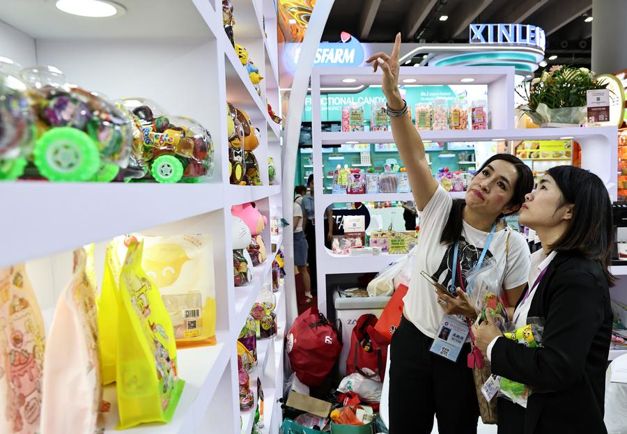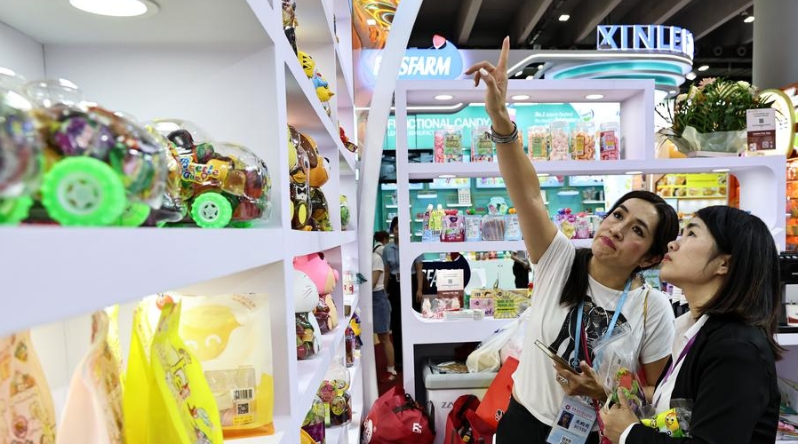 A purchaser selects food products at the 137th China Import and Export Fair in Guangzhou, south China's Guangdong Province, May 5, 2025. [Photo/Xinhua]