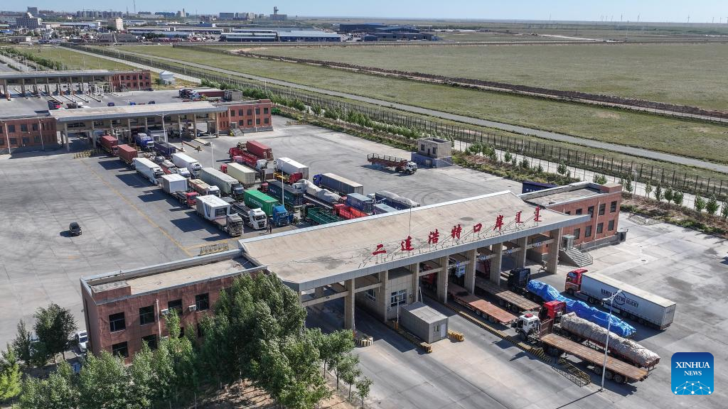 An aerial drone photo taken on Sept. 3, 2025 shows trucks waiting for border inspection at a land port in Erenhot, north China's Inner Mongolia Autonomous Region.