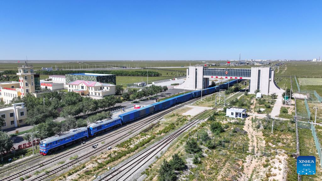 An aerial drone photo taken on Sept. 3, 2025 shows a China-Europe freight train entering a rail port in Erenhot, north China's Inner Mongolia Autonomous Region. (Photo by Guo Pengjie/Xinhua)