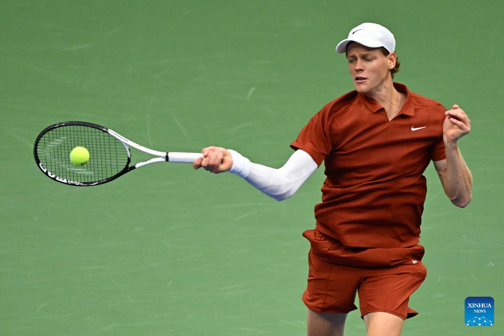Jannik Sinner of Italy hits a return during the men's singles final match between Carlos Alcaraz of Spain and Jannik Sinner of Italy at the 2025 US Open tennis championships in New York, the United States, Sept. 7, 2025. (Xinhua/Li Rui)