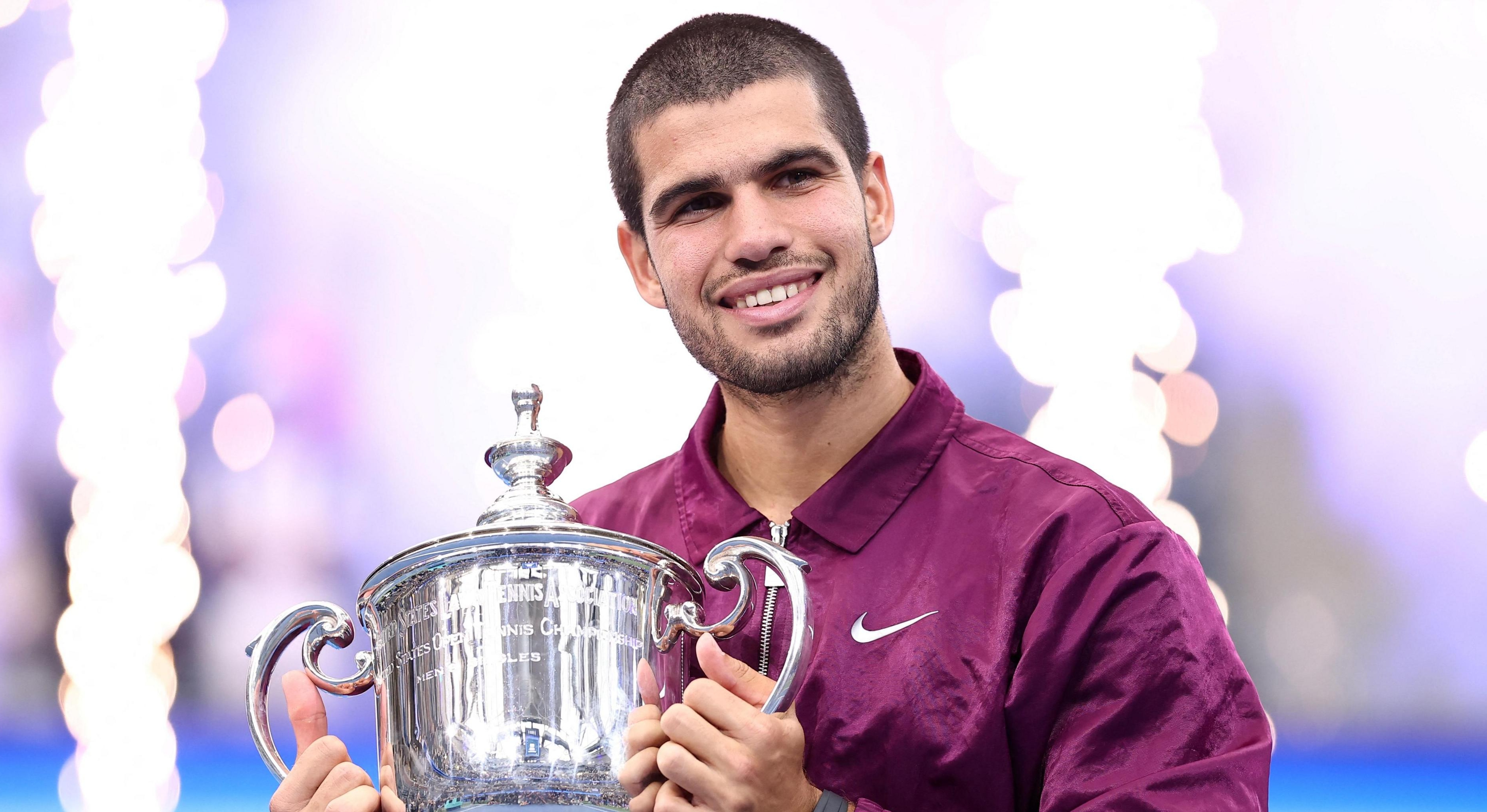 Carlos Alcaraz of Spain poses with his trophy after winning the men's singles final match between Carlos Alcaraz of Spain and Jannik Sinner of Italy at the 2025 US Open tennis championships in New York, the United States, Sept. 7, 2025. (Xinhua/Wu Xiaoling)