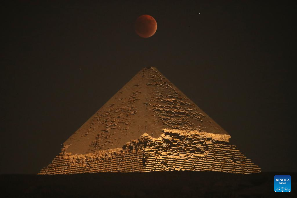 The double-exposure photo taken on Sept. 7, 2025 shows the moon during a lunar eclipse over the Pyramid of Khafre in Giza, Egypt. (Xinhua/Sui Xiankai)