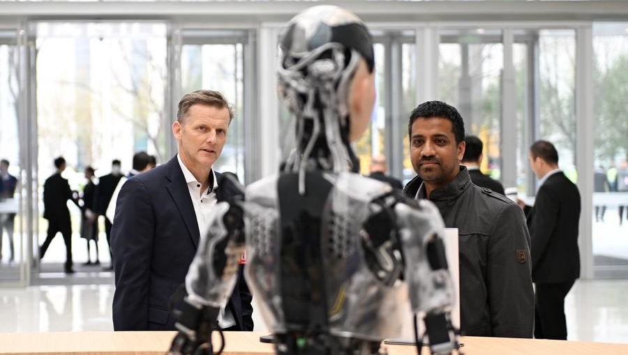 People learn about a bionic humanoid robot at the Zhongguancun International Innovation Center during the 2025 Zhongguancun Forum Annual Conference in Beijing, capital of China, March 27, 2025. [Photo/Xinhua]
