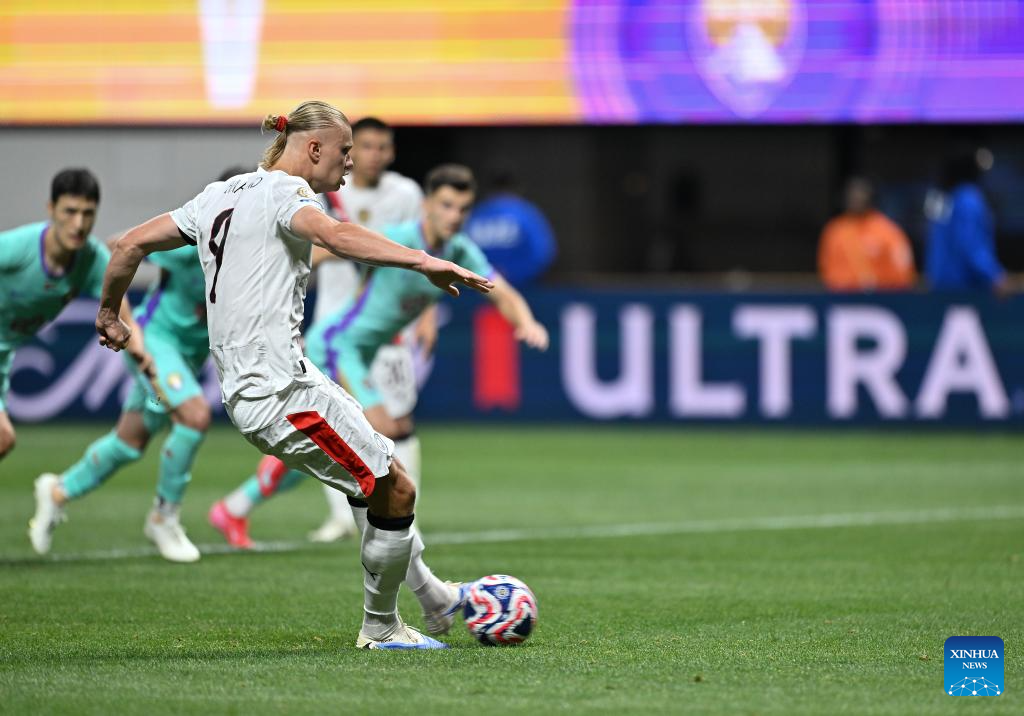 Erling Haaland of Manchester City shoots a penalty kick during the Group G match between England's Manchester City and Al Ain of UAE at the FIFA Club World Cup 2025 in Atlanta, the United States, June 22, 2025. (Xinhua/Chen Yichen)