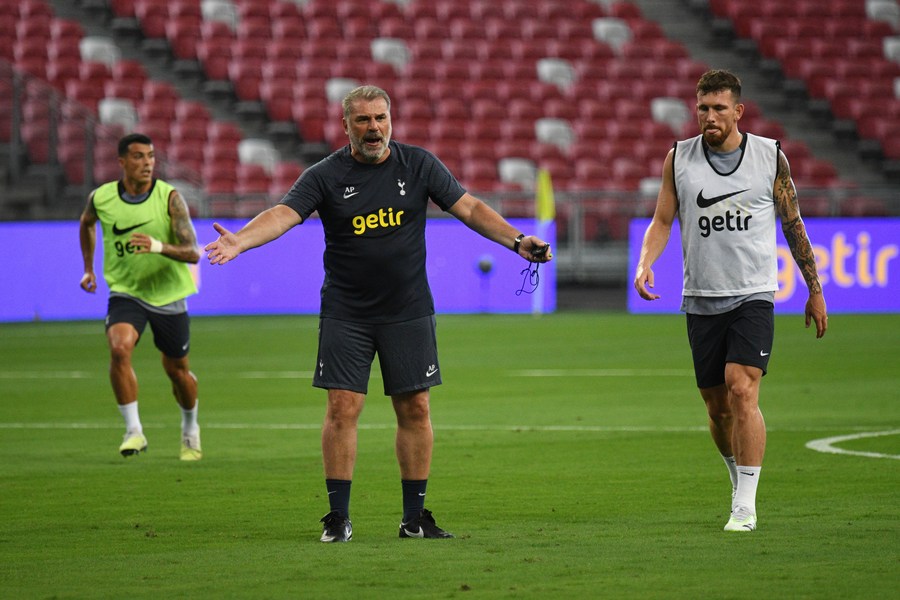 Tottenham Hotspur head coach Ange Postecoglou (C) instructs his players during an open training session in Singapore, on July 25, 2023. (Photo by Then Chih Wey/Xinhua)