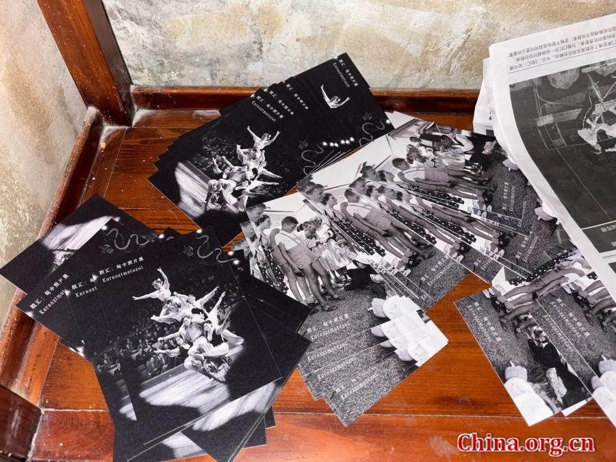 Printed postcards show the Guangdong acrobatic troupe performing on a Budapest stage, an image featured in the "Keresztmetszet" exhibition at Here Cafe in Beijing, China, Sept. 8, 2025. [Photo by Liu Ziying/China.org.cn]