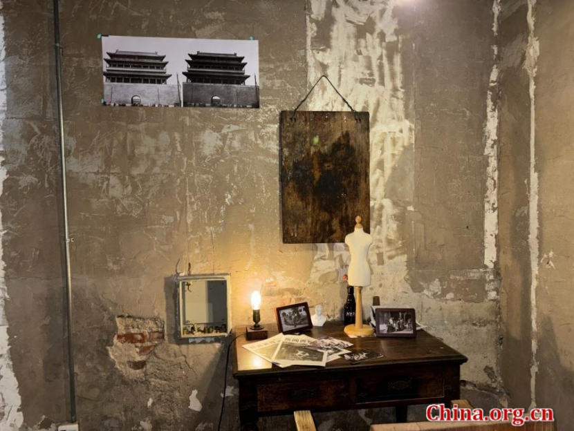 A weathered wall displays a historical photograph of Beijing's Qianmen area, while a wooden table holds prints documenting Hungarian visits to China decades ago as part of the "Keresztmetszet" exhibition at Here Cafe in Beijing, China, Sept. 8, 2025. [Photo by Liu Ziying/China.org.cn]