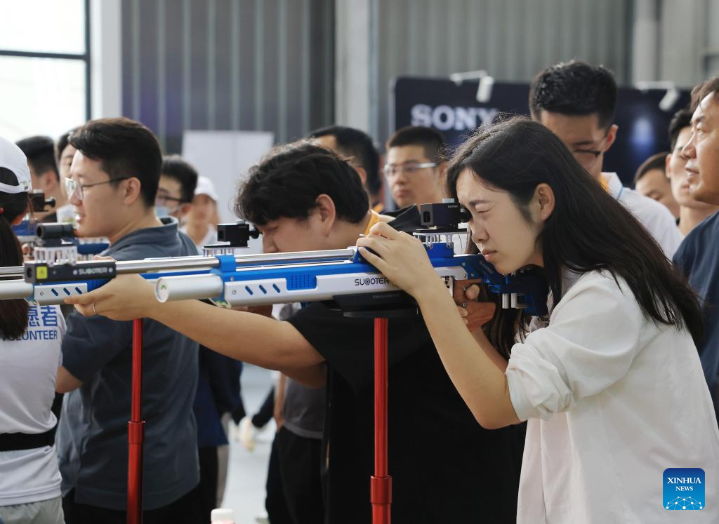 Visitors experience laser shooting at the sports services exhibition area of the 2025 China International Fair for Trade in Services (CIFTIS) in Beijing, capital of China, Sept. 11, 2025. (Xinhua/Zhang Chenlin)