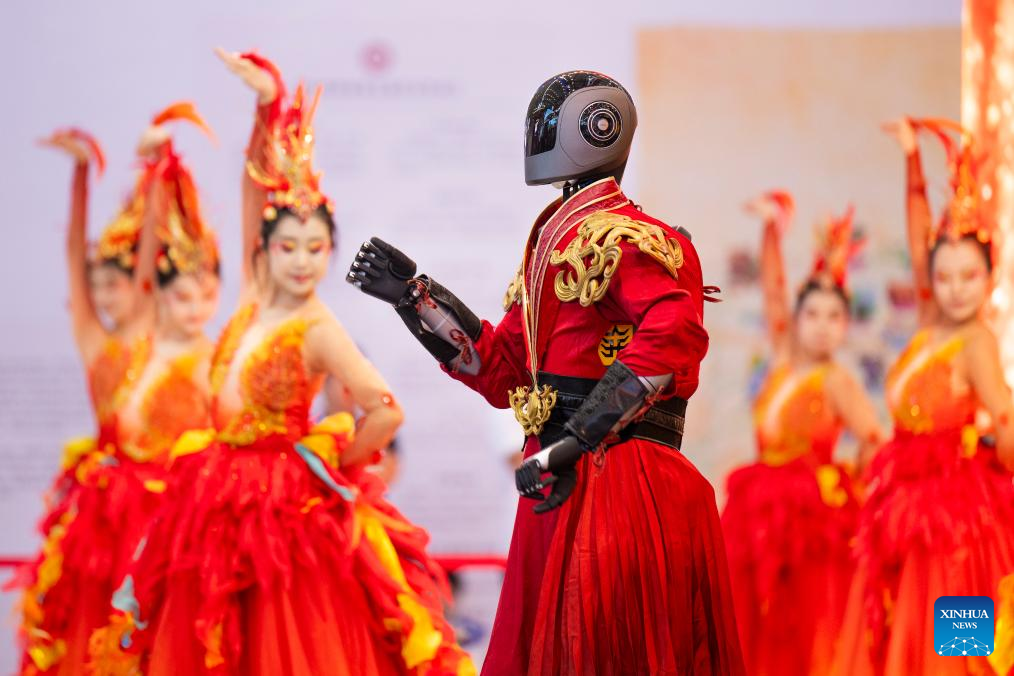 A humanoid robot participates in a dance performance at the 2025 China Culture and Tourism Industries Expo in Wuhan, central China's Hubei Province, Sept. 12, 2025. The 2025 China Culture and Tourism Industries Expo, which opened Friday in Wuhan, central China's Hubei Province, has attracted more than 2,000 domestic exhibitors and 50 overseas travel agencies.