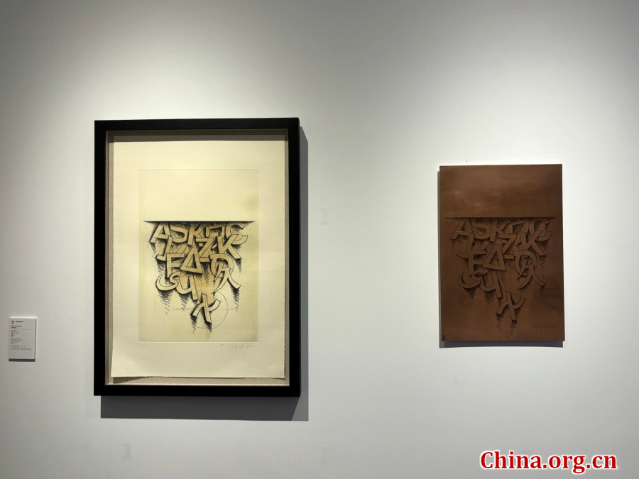 This photo, taken on Sept. 10, 2025, features "RADICI (2025)." This piece is printed on Magnani paper (edition of 30) and displayed alongside the copper plate version. This showcases the printmaking process, highlighting the transfer of form, a theme throughout the exhibition, but in this case from metal to paper. [Photo by Liu Ziying/China.org.cn]