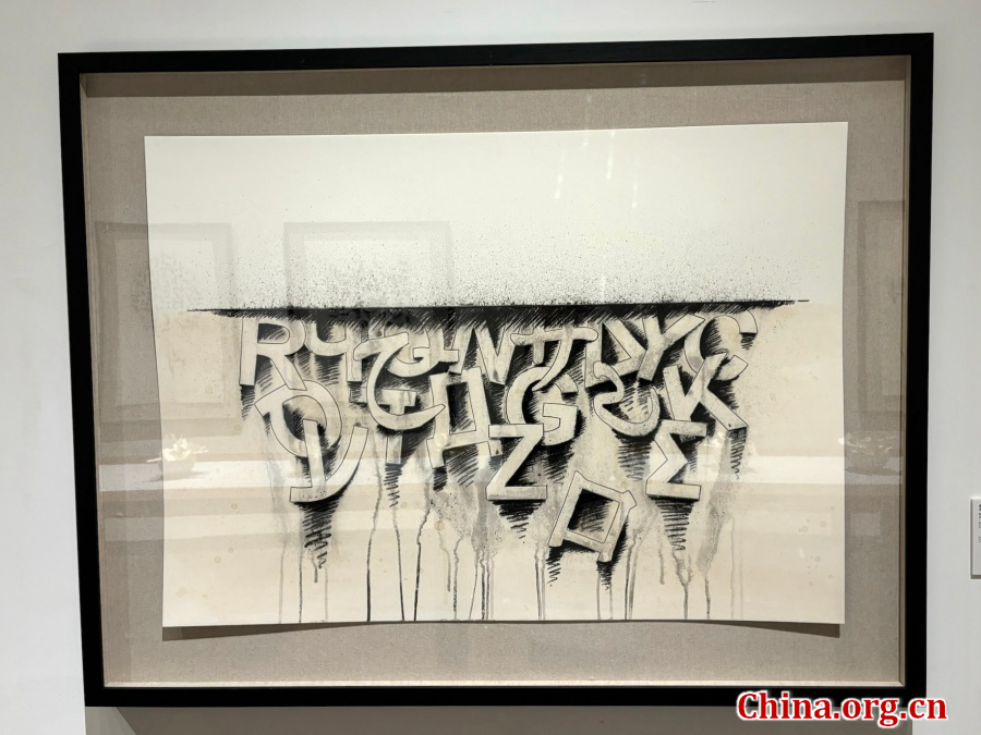 This photo, taken on Sept. 10, 2025, shows "ORIGINI (2025)," where compositional simplicity and the texture of the surface explore origin stories through the interplay of drawing and relief. [Photo by Liu Ziying/China.org.cn]