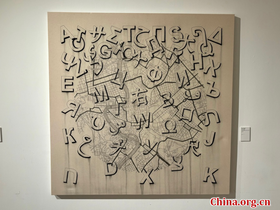 This photo, taken on Sept. 10, 2025, features "THE DIALOGUES: Human Scape (2025)," a mixed-media canvas. Glyph-like symbols converge into a rhythmic pattern, evoking the dynamic density and flow of human presence. [Photo by Liu Ziying/China.org.cn]