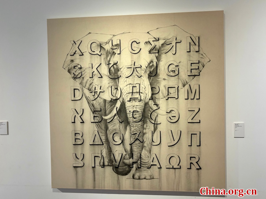 This photo, taken on Sept. 10, 2025, shows "THE DIALOGUES: Fauna (2025)." Layered characters from different cultures form a wall in front of the approaching elephant. It represents the idea of how human cognition and the vitality of nature complement one another. [Photo by Liu Ziying/China.org.cn]