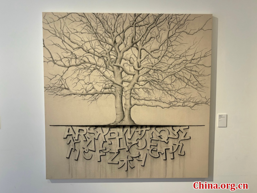 This photo, taken on Sept. 10, 2025, shows "THE DIALOGUES: Flora (2025)." Its interwoven lines evoke vegetal growth, tracing the cycles of natural regeneration through abstracted characters. What lies beneath the surface look like roots, but they too reflect the mirrored relationship between humanity and the natural world. [Photo by Liu Ziying/China.org.cn]