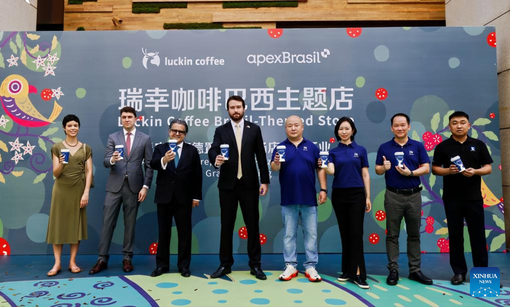 Luckin Coffee, a leading Chinese coffee chain, officially opened its first Brazilian coffee-themed store in the Guangdong-Hong Kong-Macao Greater Bay Area in the city of Guangzhou, south China's Guangdong Province, on Monday.
