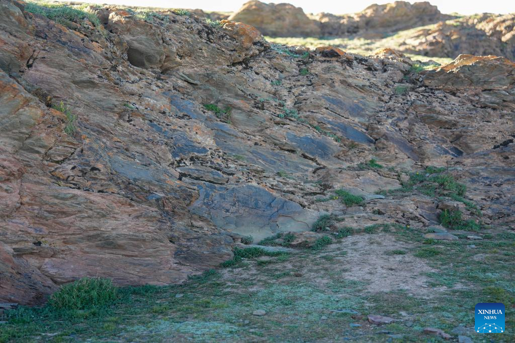 This photo taken on July 25, 2025 shows the Qin Dynasty engraved stone discovered on the northern shore of Gyaring Lake in Maduo County, northwest China's Qinghai Province. [Photo/Xinhua]