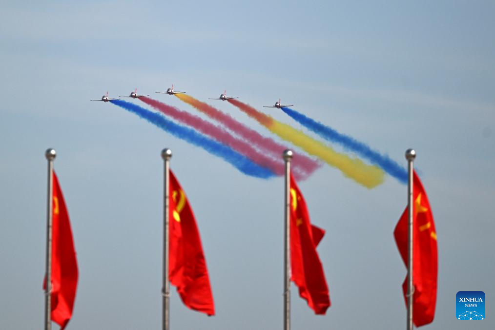 Aircraft of China's Red Falcon Aerobatic Team perform during the 2025 aviation open-day activities of the Chinese People's Liberation Army Air Force and Changchun Air Show in Changchun, northeast China's Jilin Province, Sept. 19, 2025. The events kicked off here on Friday. [Photo by Yu Hongchun/Xinhua]