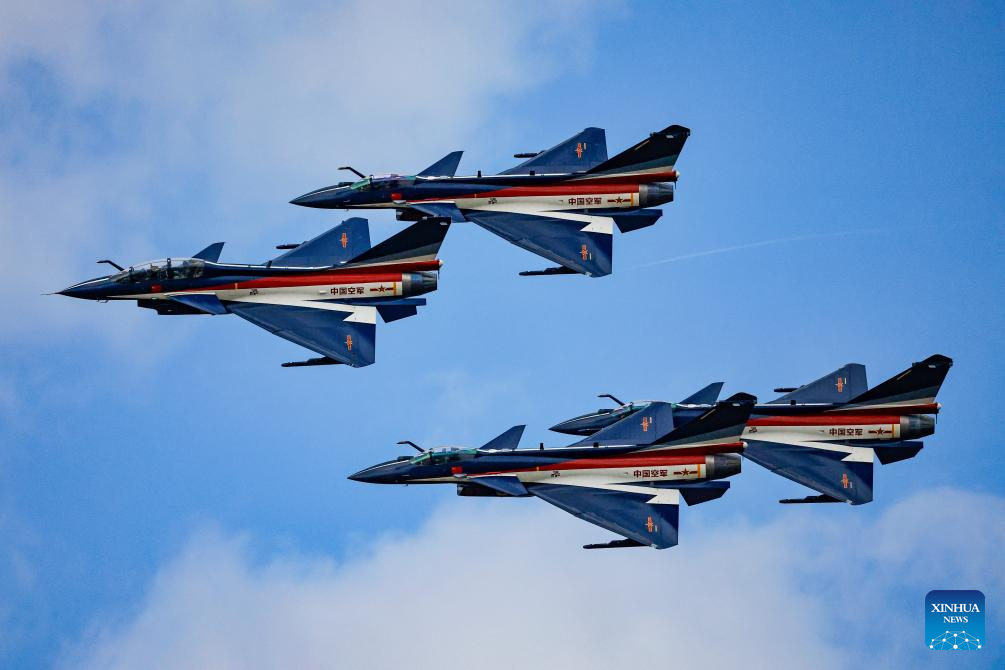 Aircraft of the Bayi Aerobatic Team of the Chinese People's Liberation Army Air Force perform during the 2025 aviation open-day activities of the Chinese People's Liberation Army Air Force and Changchun Air Show in Changchun, northeast China's Jilin Province, Sept. 19, 2025. The events kicked off here on Friday. [Photo by Tan Sicheng/Xinhua]
