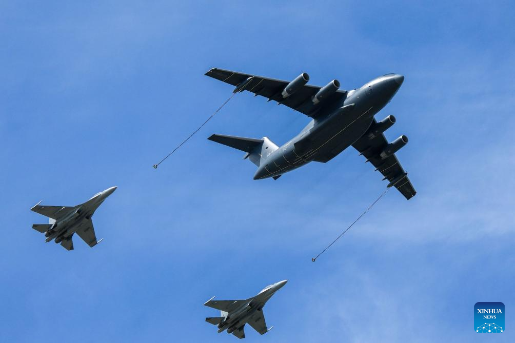 A YY-20A tanker aircraft and two J-16 fighter jets are pictured during the 2025 aviation open-day activities of the Chinese People's Liberation Army Air Force and Changchun Air Show in Changchun, northeast China's Jilin Province, Sept. 19, 2025. The events kicked off here on Friday. [Xinhua/Yan Linyun]